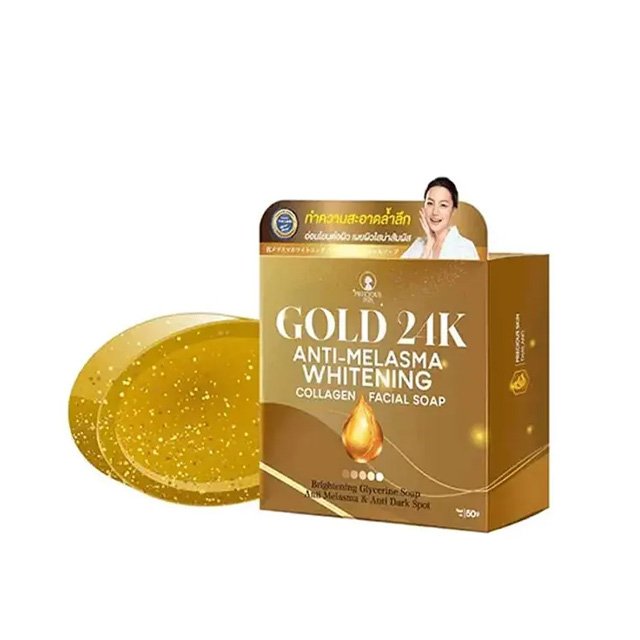Precious Skin Thailand Gold 24K Anti-Melasma Whitening Collagen Facial Soap contains a mixture of pure gold and collagen, helping to soothe dry skin while nourishing it. Deeply cleanses your skin. It is gentle on sensitive skin, skin prone to acne and freckles. Helps to make your skin smooth and naturally glowing. Reduces wrinkles, melasma, freckles and dark spots. Restores skin elasticity, making the skin soft and moisturized, as well as good moisture retention in the skin.