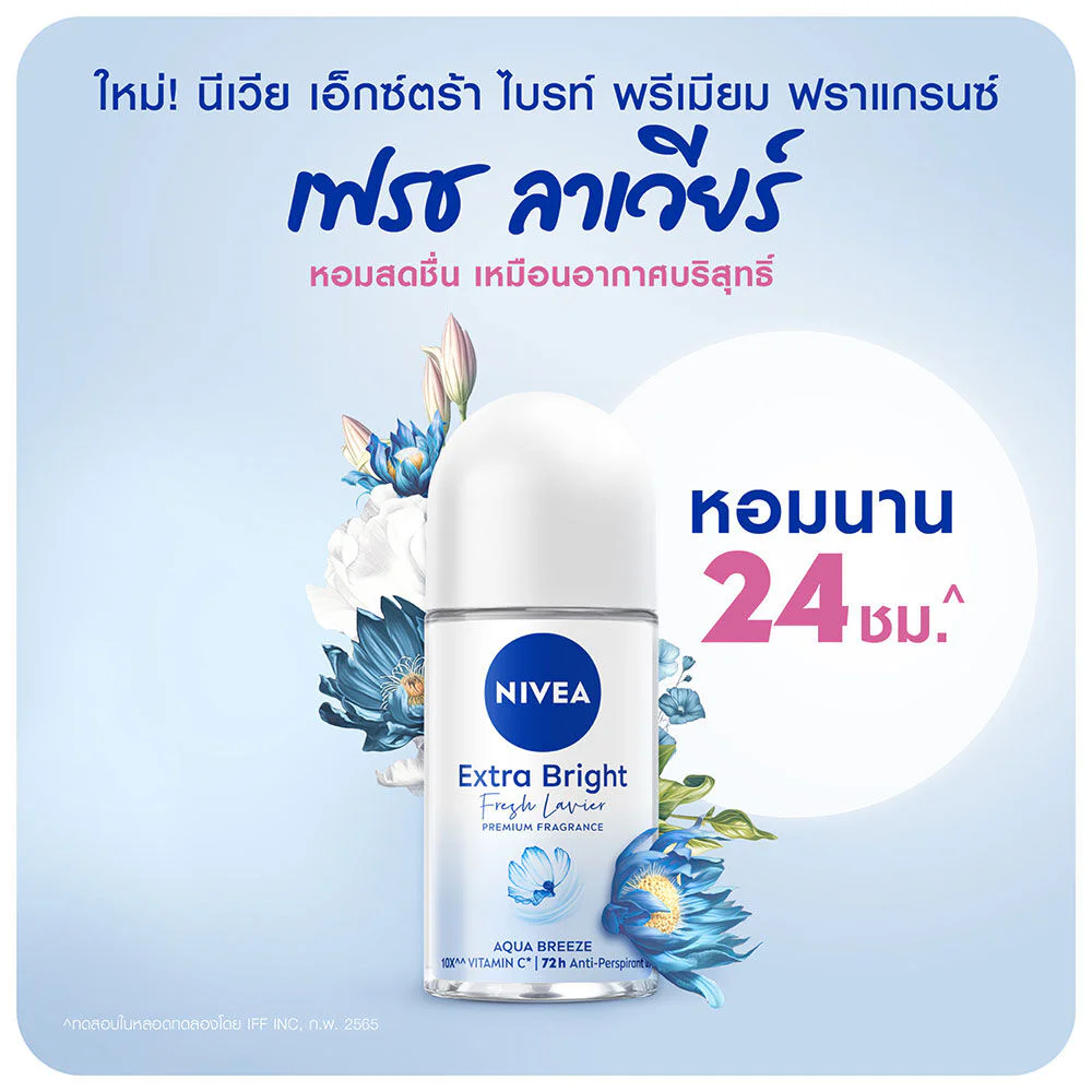 NIVEA Extra Bright Premium Fragrance Fresh Lavier Aqua Breeze Roll On 50ml Antiperspirant and deodorant product with a fresh, long-lasting scent that helps restore dull, damaged skin to look brighter with 10 times more vitamin C. It gives a fresh, charming scent, like breathing fresh air. It is suitable for bright girls who want to change the atmosphere around them to be pure and fresh.